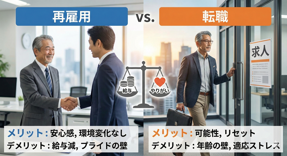この記事では、定年後の2大選択肢である「再雇用」と「転職」について、それぞれのメリット・デメリットを徹底比較し、あなたが後悔しない選択をするための判断基準を解説します。