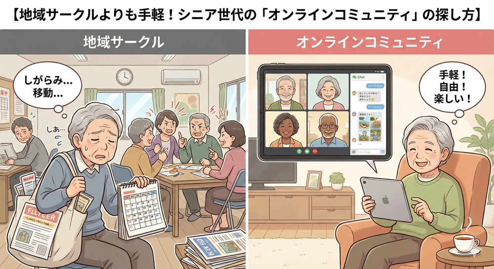かつては「リタイア後の居場所=地域社会」一択でしたが、今は違います。 インターネットの中に、「しがらみなし」「移動なし」「気遣い不要」の新しい居場所が無数に存在しています。それが「オンラインコミュニティ」です。