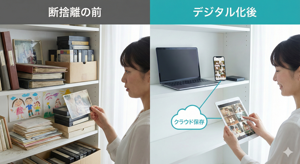 思い出の品を捨てられないのは、「過去を失う恐怖」があるからです。 しかし、デジタル化という手段を使えば、過去(データ)を守りながら、未来(生活空間)を広げることができます。