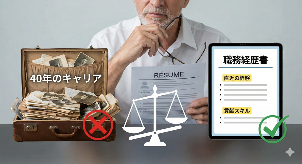 実は、シニアの応募書類において「書きすぎ」は「書かなさすぎ」と同じくらいのリスクがあります。採用担当者が知りたいのは、「あなたが過去にどれだけ偉かったか」ではなく、「今のあなたがうちの会社で何をしてくれるか」だからです。