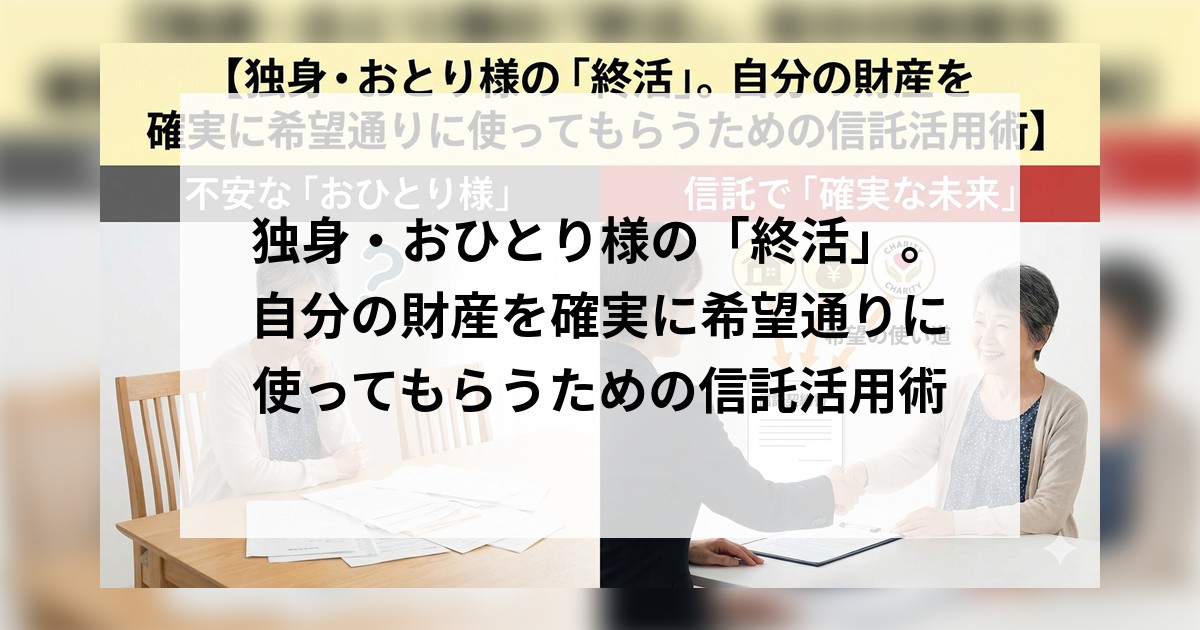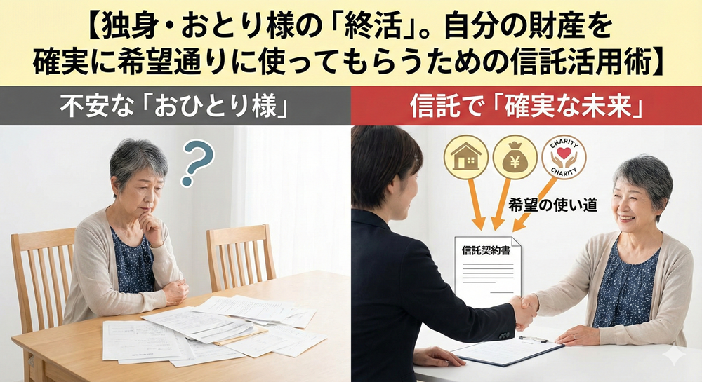 この記事では、独身・お子様なし世帯の方が、最後まで自分らしく生き、自分の財産を希望通りに使い切るための「信託活用術」を解説します。