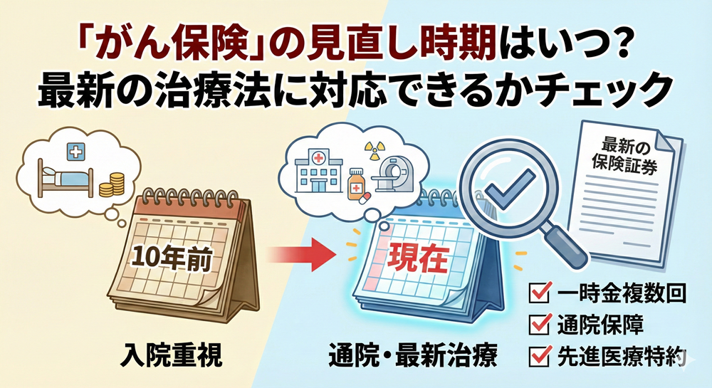 定期型のがん保険に入っている場合、10年ごとの更新で保険料が上がります。通知が来たら、そのまま更新するのではなく、「同じ保険料で、最新の内容の他社商品に入れないか?」と比較する絶好のチャンスです。