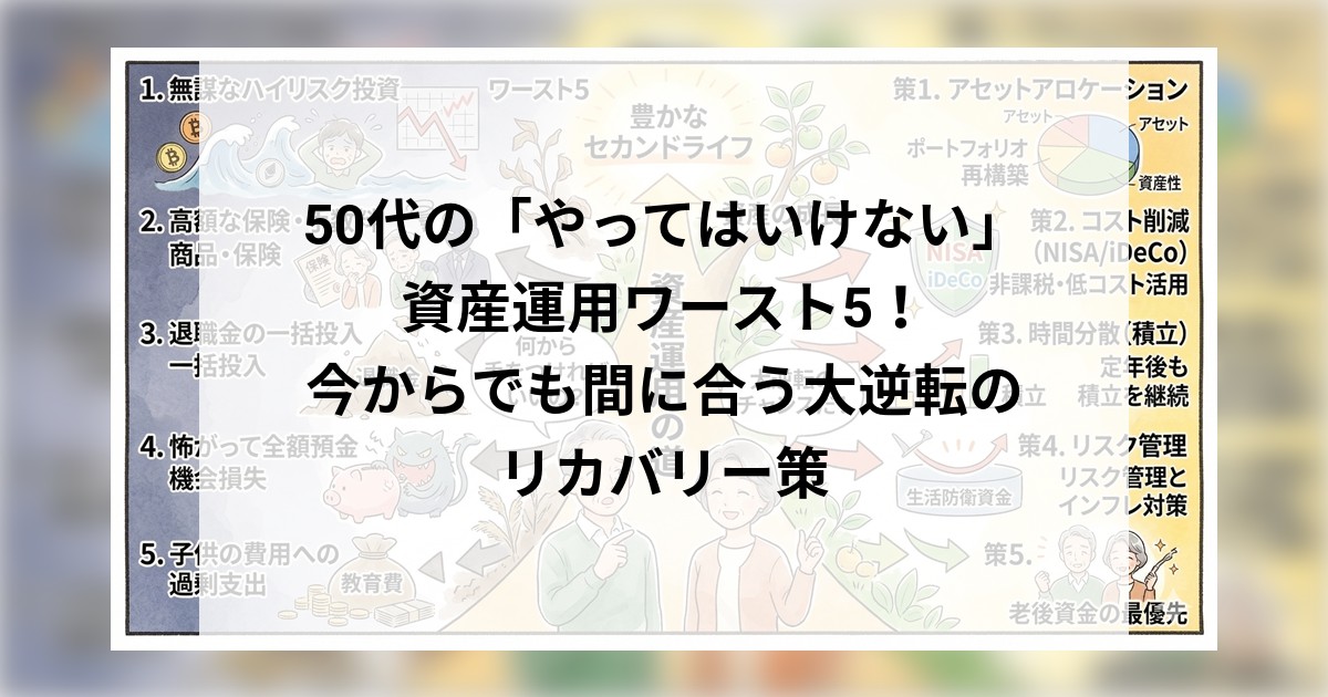 この記事では、50代が陥りがちな「やってはいけない資産運用」ワースト5を提示し、万が一足を踏み入れてしまっている場合の「大逆転リカバリー策」を徹底解説します。
