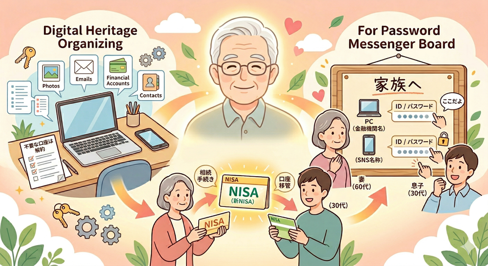 60代は、まだスマホ操作も記憶力もしっかりしている「整理の黄金期」です。 「どのサイトに、どのお金があるか」 このシンプルな情報を家族に共有できる仕組みを作るだけで、あなたのNISA資産は、次世代へ確実に、そして感謝とともに受け継がれるはずです。