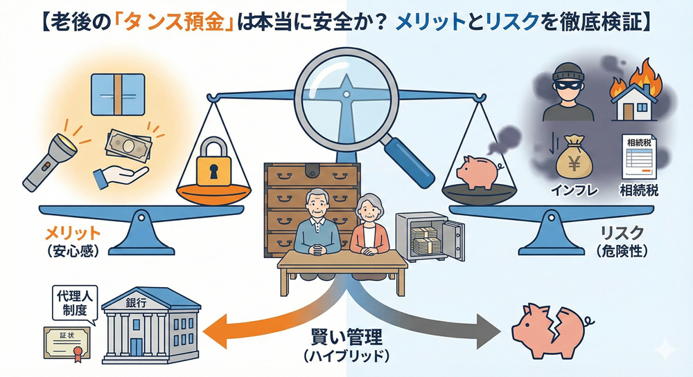 この記事では、老後のタンス預金が持つ「本当のメリット」と、多くの人が見落としている「致命的な4つのリスク」を徹底検証し、賢い現金の持ち方を提案します。