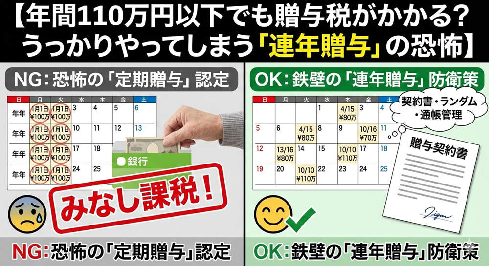 この記事では、よかれと思ってやっている「毎年の贈与(連年贈与)」が、なぜ税務署に否認されるのか、そのメカニズムと、絶対に否認されないための「5つの防衛策」を解説します。