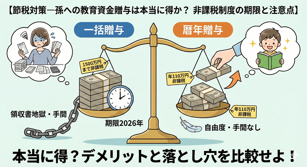 この制度を使うべきなのは、「孫がもう高校生・大学生で、数年以内に多額の教育費がかかる」かつ「相続税対策として、自分の資産を一気に減らしたい」という方に限られます。